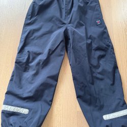 Ett par mörkblå överdragsbyxor storlek 86 med hängslen från Polarn O. Pyret. Byxorna har resår i midjan, reflexer nedtill och en liten logga på benet.