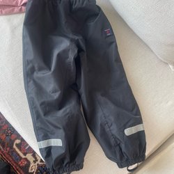 Ett par mörkblå överdragsbyxor med svarta förstärkningar på knän och sidor. Byxorna har justerbara hängslen med text och reflexdetaljer nedtill på benen. I fint begagnat skick