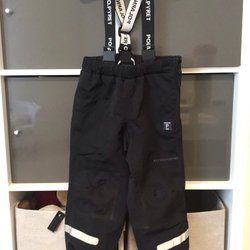 Ett par blå Polarn O. Pyret byxor med svarta förstärkningar på knän och sidor. Byxorna har justerbara hängslen med text och reflexer på benen. Resår i midjan och bensluten samt fothällor.