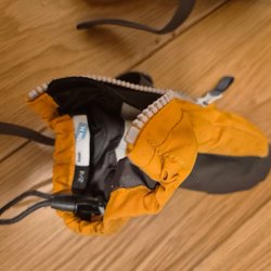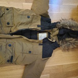 kamouflagefärgad jacka med huva och dragkedja. Jackan har två fickor fram. Vattentät och fodrad, lite bruksslitage men i gott skick.