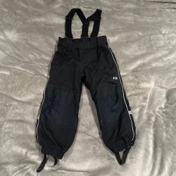 Ett par svarta överdragsbyxor med justerbara hängslen, från Lindex (FIX). Storlek 92. Inget synligt slitage på själva byxorna, lite på fothällorna