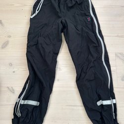 Svarta överdragsbyxor med justerbara hängslen och reflexdetaljer. Byxorna har dragkedja på sidan och "PO.P WEATHER PRO" tryckt på benet.