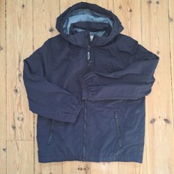 Jackan är brun och mörkblå jacka med avtagbar huva. Fleecefodrad luva och kropp, ej fodrade armar.