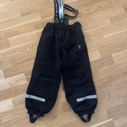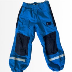 Mörkblå skalbyxor i stl 110 från Polarn O. Pyret med hängslen och förstärkta knän. Hela och rena vad jag kunnat se.