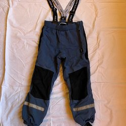 Ett par mörkblå skalbyxor från Po.P med resår i midjan och dragkedja i sidornal på benen. Reflexer finns på benen. En ficka med dragkedja baktill.