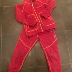 Ett par Didriksons barnbyxor i storlek 110. Byxorna är i färgerna rosa och svart. De har justerbara hängslen och resårband nedtill. Det finns ett litet hål på ena benet som syns på ett foto, men skulle säga att byxorna ha mycket kvar att ge.