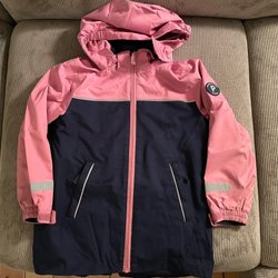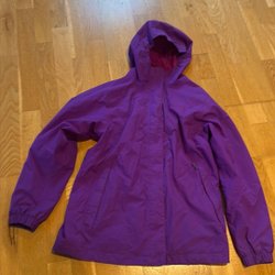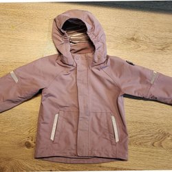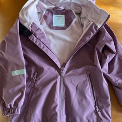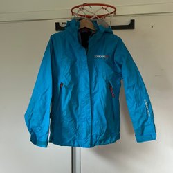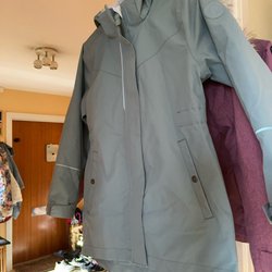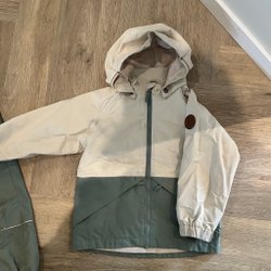 Grön jacka med tunt foder, luva och dragkedja. Fickor med dragkedja fram.