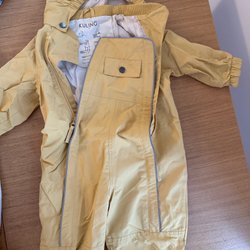 Senapsgul overall med ett mönster av rävansikten över hela plagget. Den har en huva och en dragkedja framtill. Ärmarna och benen avslutas med svarta muddar. Fleecefodrad.