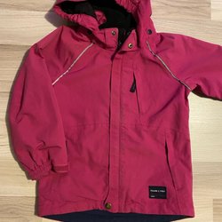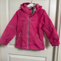 Färgglad jacka från Polarn O. Pyret i rosa och marinblått. Jackan har en avtagbar huva och dragkedja framtill.