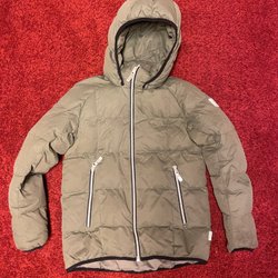 Jackan är marinblå med praktiska fickor och mönstrad insida. Muddar i ärmarna. Avtagbar huva.
