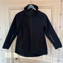 Svart jacka med huva från Polarn O. Pyret. Jackan har en dragkedja framtill och reflexdetaljer. Det finns en namnlapp på insidan. Fin jacka som har mkt kvar att ge.