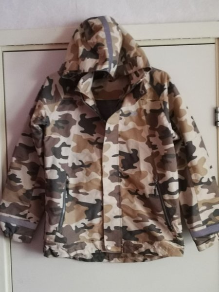 Jacka med huva och dragkedja. Jackan har ett kamouflagemönster i olika nyanser av brunt, beige och grått. Reflexdetaljer finns på ärmarna och huvan.