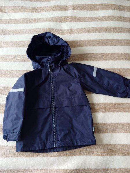 Mörkblå jacka med huva och dragkedja framtill. Jackan har reflexer på ärmarna.