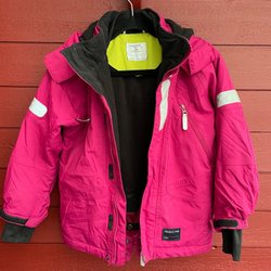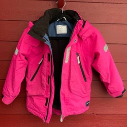 Ett set med fodrade regnkläder från Didriksons i storlek 120. Setet består av en jacka och ett par hängselbyxor. Jackan är i färgerna ljusblå och mörkblå med vita reflexer. Hängselbyxorna är i färgerna mörkblå och ljusblå med vita reflexer. Syns att kläderna är använda och lite slitage, se bilder.