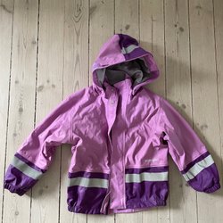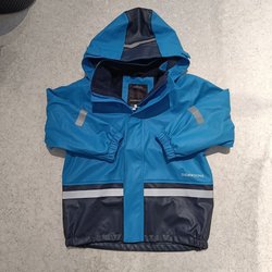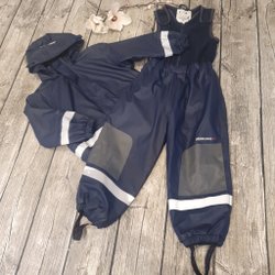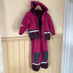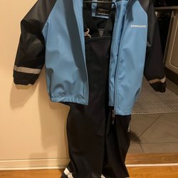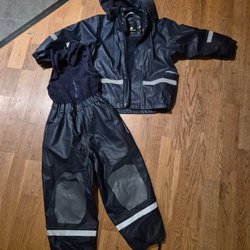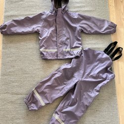 Ett regnställ från Celavi i storlek 110. Sparsamt använt regnställ, dock är hällorna för skorna trasiga. Viss slitage i sömmen, se bild.