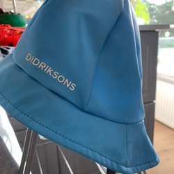 Fodrat regnset med jacka och byxor. Jackan är gul och ljusblå med reflexer och dragkedja. Byxorna är ljusblå med hängslen och reflexer. Den ena snodden för skor är trasig (se bild)