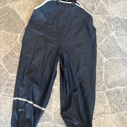 Ett par svarta regnbyxor med resår i midjan och reflexer nedtill på benen.