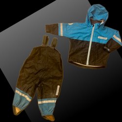 Regnställ i ljust och mörkt blått med reflexdetaljer. Jackan har huva och dragkedja framtill. Byxorna har hängslen och resår i bensluten. Välanvänt med allmänt ytslitage (se bilder), invändigt missfärgat, trasiga hällor (går att byta ut), ett litet jack i jackans nederkant (se bild 7). Vi har trots detta inte upplevt något problem med regnställets funktion.