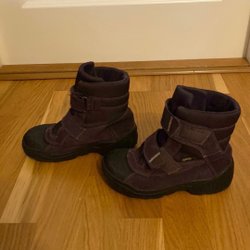 Ett Didriksons regnställ i lila och mörklila med reflexer. Regnjackan har en huva och dragkedja. Regnstället är tvättat inför försäljning. Det har använts och jag försöker beskriva slitaget som finns så får du bedöma själv. Jacka, några små sprickor i nylonet längst ner på ryggen( knappt synbara) se bild 5, lite missfärgat fram på mage, se bild 3, se oxå bilder på slitage underarmar, i övrigt normalt slitage på reflexer. Regnbyxorna har svarta förstärkningar på knäna. Slitage i grenen , se bild, sprickor i nylon nertill vid fötter. Där det finns sprickor vid fötter och rygg är det galon även på insidan så det håller tätt ändå. Regnstället är Varmfodrat Håller mycket lek och bus ännu men vill vara tydlig med dom fel som finns. Vikt 1068 gram