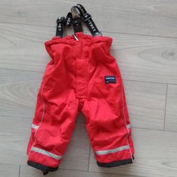 Ett regnställ från Didriksons. Setet består av en röd regnjacka med huva och ett par svarta regnbyxor med hängslen.