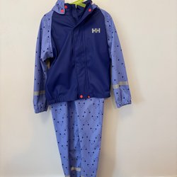 Ett regnställ från Helly Hansen i blått och svart. Setet består av en jacka med huva och ett par byxor med hängslen. Båda delarna har reflexdetaljer.