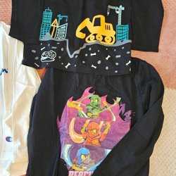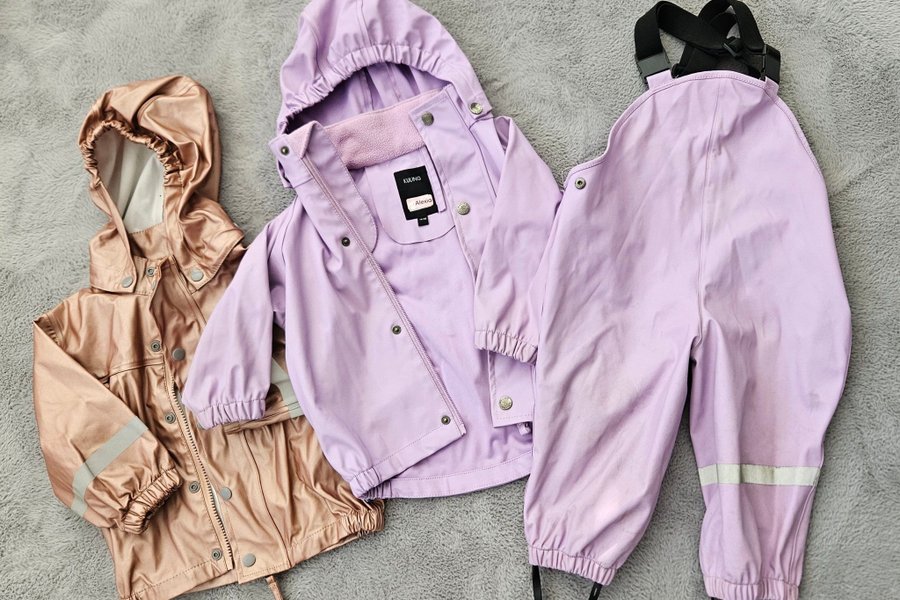 Ett set med regnkläder. Setet innehåller en jacka i ljuslila och ett par regnbyxor i matchande färg med justerbara hängslen. Det finns även en jacka i en skimrande rosa färg.