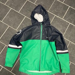 Fint regnställ från Didriksons. Jackan är randig i flera färger och har en huva. Regnbyxorna är mörkblå med reflexer och hängslen.