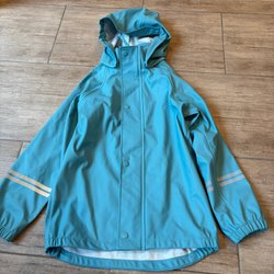 Regnjacka i turkos färg med huva. Jackan har resår vid ärmslut och fickor framtill. Insidan av huvan har ett randigt mönster i grönt och gult .Från djur,rökfritt hem.