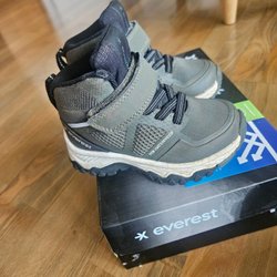 Regnställ med jacka och byxor. Jackan har en avtagbar huva och knäppning framtill. Byxorna har justerbara hängslen och resår vid bensluten.