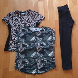 Ett par mönstrade byxor med resår i midjan. Byxorna har ett unikt tryck med inslag av blommor, blad och abstrakta former i svart, vitt, rosa och gula toner. Storlek 158-164. Inga defekter, väldigt sköna. Perfekt för idrotten. Har en tillhörande överdel till.