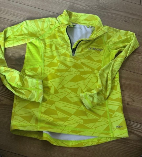 Långärmad träningströja med dragkedja i halsen. Tröjan har ett mönster i olika nyanser av gult och grönt. Det finns meshpaneler under ärmarna för ventilation. Mycket fint skick.