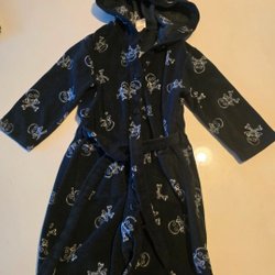 Rosa med vita prickar, huva, knäppning fickor och knytband i midjan. Knytband är fast i rocken ej avtagbart. Från Kappahl i mycket fint skick