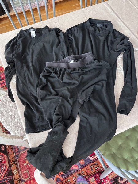 Underställ, två tröjor och ett par byxor från Everest i bra använt skick. Färg svart (ser lite blekt ut på bilden men det är det inte). Inga hål men svaga noppor som kom direkt efter användning och tvätt.