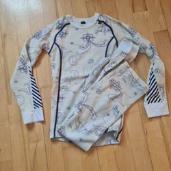 Ett mörkblått underställ med långärmad tröja och byxor från Helly Hansen, strl 92. 57% merinoull, resterande polyester. Använd en gång.