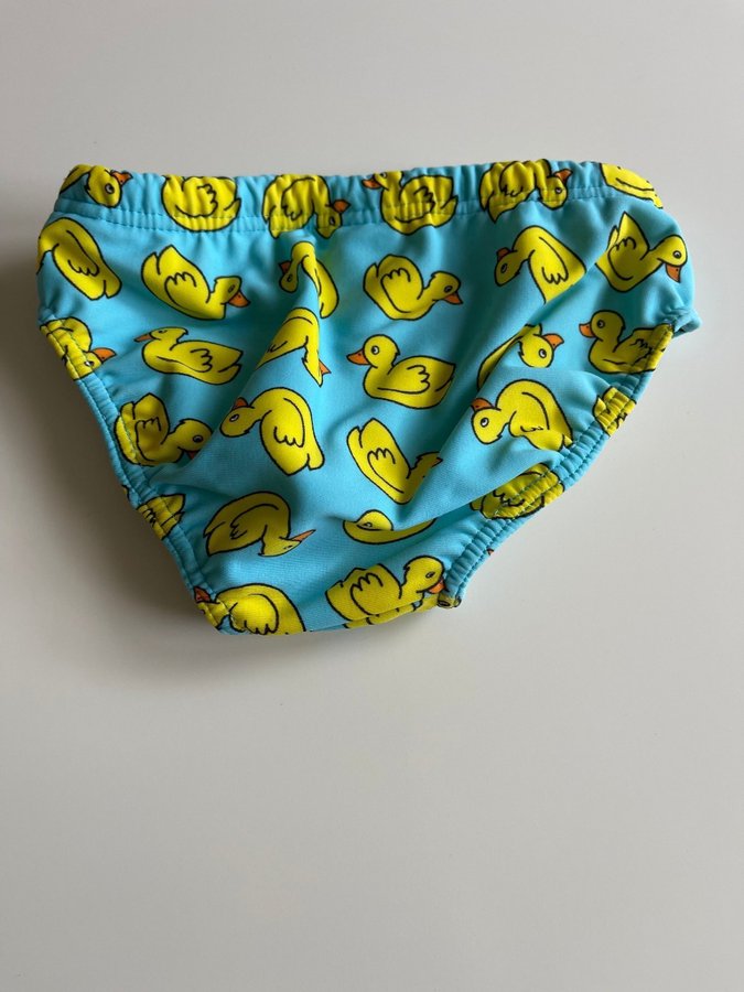 Söta badbyxor med ett mönster av gula ankor på en ljusblå bakgrund. Badbyxorna har en orange dragsko i midjan.