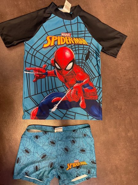 Ett set med en Spiderman-tröja med korta ärmar och ett par matchande badbyxor. Båda plaggen har ett Spiderman-tema med spindelnät och Spiderman-logotyper.