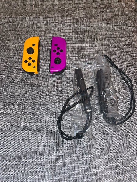 Säljer ett par Nintendo Switch Joy-Cons. En gul och en lila. Handledsremmar ingår.