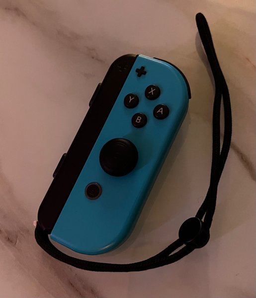 Nintendo Switch Joy-Con i blått. Kontrollen har en analog spak, fyra ansiktsknappar (A, B, X, Y) och en plus-formad D-pad. En svart handledsrem medföljer.