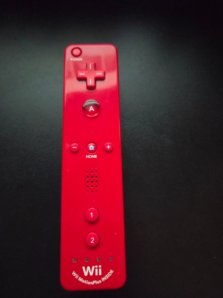Wii MotionPlus Inside handkontroll i röd färg. Kontrollen har knappar för Power, A, Home, Plus, Minus, 1 och 2. Den har även en styrkors.