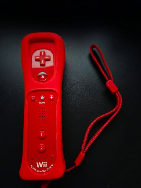 Röd Wii-handkontroll med inbyggd MotionPlus-teknik. Kontrollen har en handledsrem.