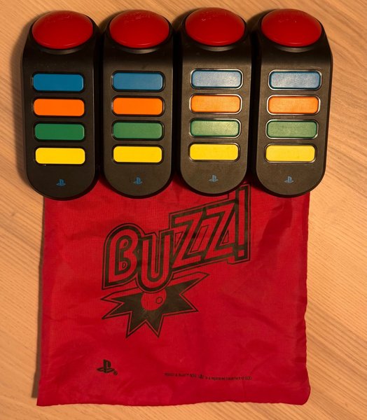 Fyra Buzz! kontroller för Playstation. Inkluderar en röd förvaringspåse med Buzz! logotyp.