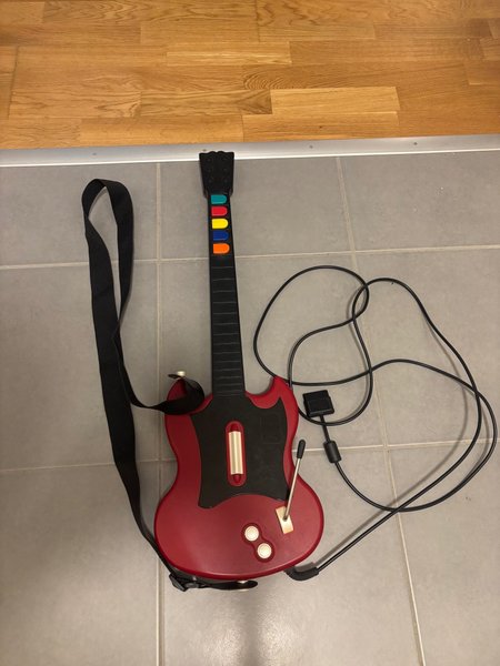 Gitarrkontroll för Guitar Hero. Denna röda gitarrkontroll har en svart rem och en anslutningskabel. Den är designad för att användas med Guitar Hero-spel.