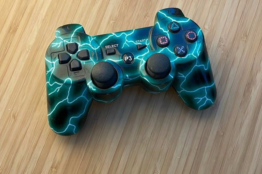 Defekt tredje parts kontroll till PlayStation 3, med ett grönt blixt mönster.