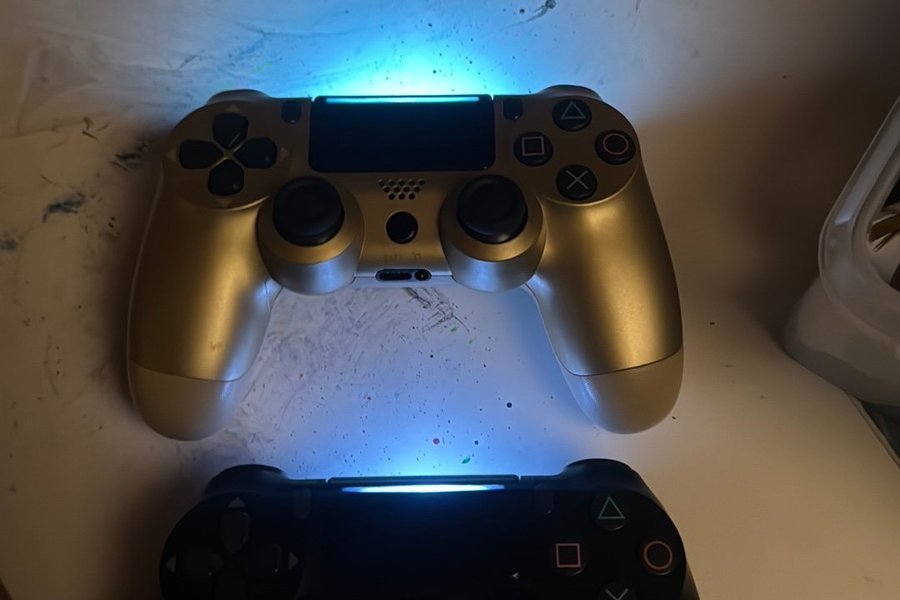 Två handkontroller till Playstation 4. En guldfärgad och en svart. Den svarta är orginal o den guldiga står det ej playstation på så misstänker att den inte är orginal . Dom ljuser när man slår på dom men då jag inte har något ps4 kvar säljs dom som defekta då jag ej kan testa dom .
