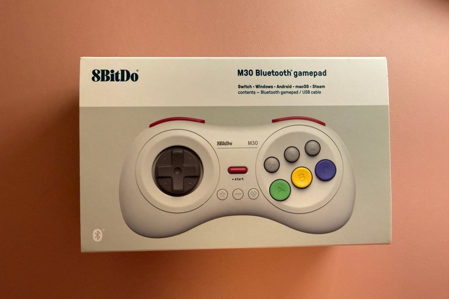8BitDo M30 Bluetooth gamepad är kompatibel med Switch, Windows, Android, macOS och Steam. Förpackningen innehåller en Bluetooth-gamepad och en USB-kabel.