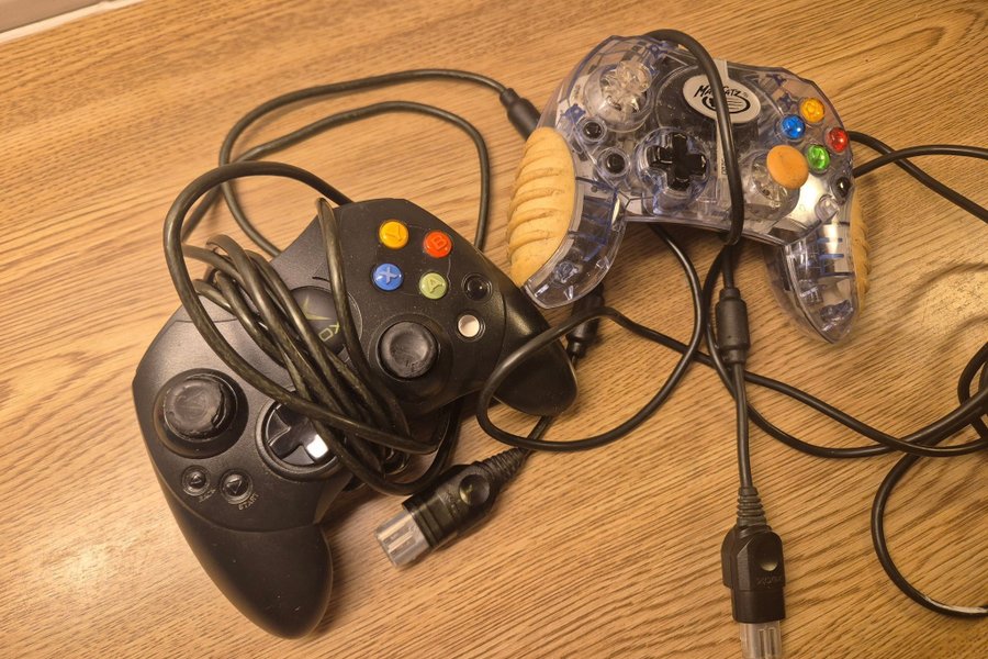 Två Xbox-kontroller säljes. En svart originalkontroll och en genomskinlig Mad Catz-kontroll. Jag har fått dessa med på större köp med spel och har själv ingen xbox så jag kan testa dom, så säljes som otestade/defekta