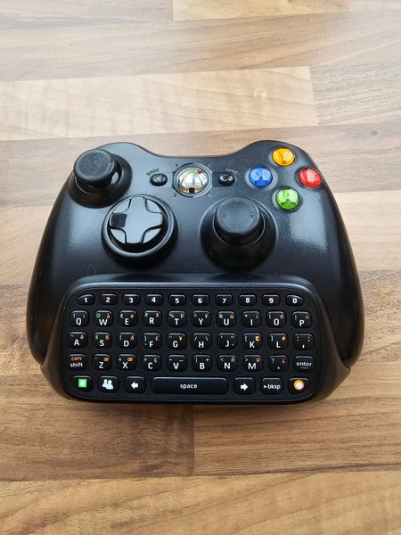 Svart Xbox 360-handkontroll med integrerat tangentbord (Chatpad). Handkontrollen har de klassiska Xbox-knapparna, två analoga spakar och en D-pad. Chatpad-tangentbordet har alfanumeriska tangenter och specialtecken för enkel textinmatning.
