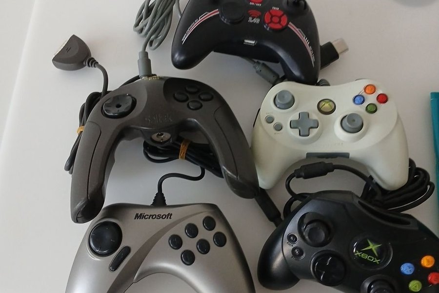 Parti med fem spelkontroller. Inkluderar en svart Xbox-kontroll, en vit Xbox 360-kontroll, en grå Microsoft Sidewinder-kontroll, en grå Saitek P2500 Rumble Pad och en svart Saitek P880 Dual Analog Pad.