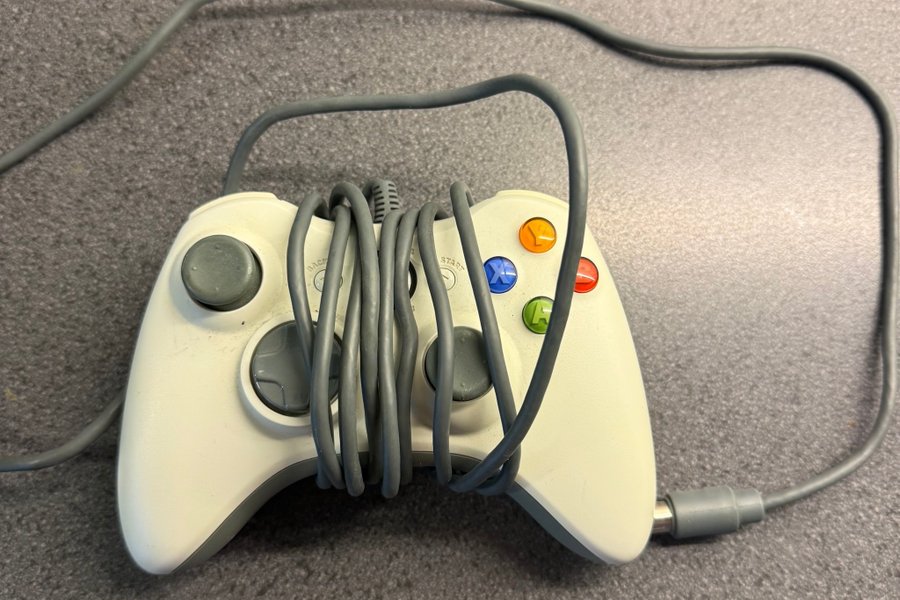 Handkontroll till Xbox 360. Färg: vit med grå kabel. Knapparna har färgerna blå, grön, röd och orange.