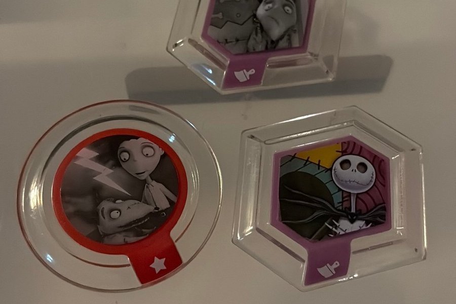 Tre Disney Infinity-discs säljes. Inkluderar figurer från Corpse Bride och The Nightmare Before Christmas.